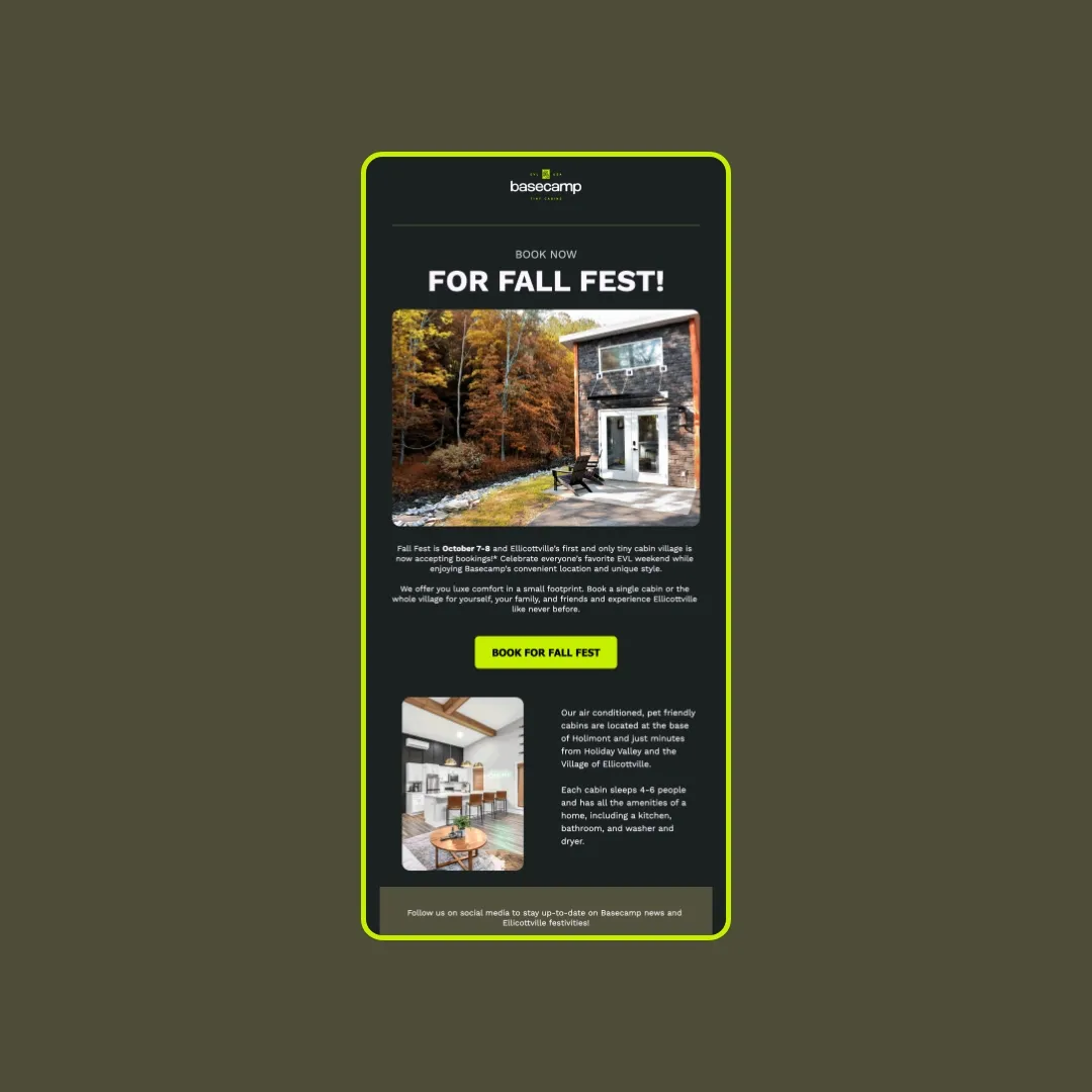 Digital channels were flooded with evocative imagery: A cozy Basecamp cabin blanketed in snow, minutes away from bustling ski slopes; the glow of a campfire against the backdrop of a starry Ellicottville night; a group of friends toasting to a bachelor party in the heart of nature. With every organic or paid effort, we weren't just promoting a place to stay; we were selling an experience.