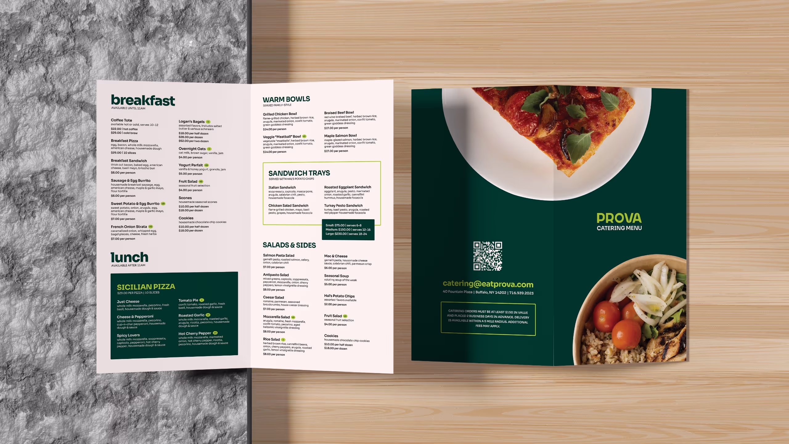 We partnered with Prova, a fast-casual restaurant in Buffalo's Fountain Plaza, to create a brand that blends sophistication with approachability. Known for its freshly made pizzas, vibrant grain bowls, market offerings, and curated wine and beer bar, Prova caters to Fountain Plaza tenants and downtown professionals seeking healthy yet affordable options. As a breakfast, lunch, and happy hour destination, the brand balances convenience with elevated dining experiences.